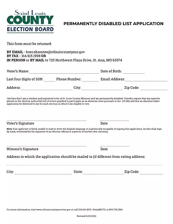 Voters who are permanently disabled may also apply for permanent absentee by mail status by filling out Permanently Disabled List Application from the St. Louis County Board of Elections.